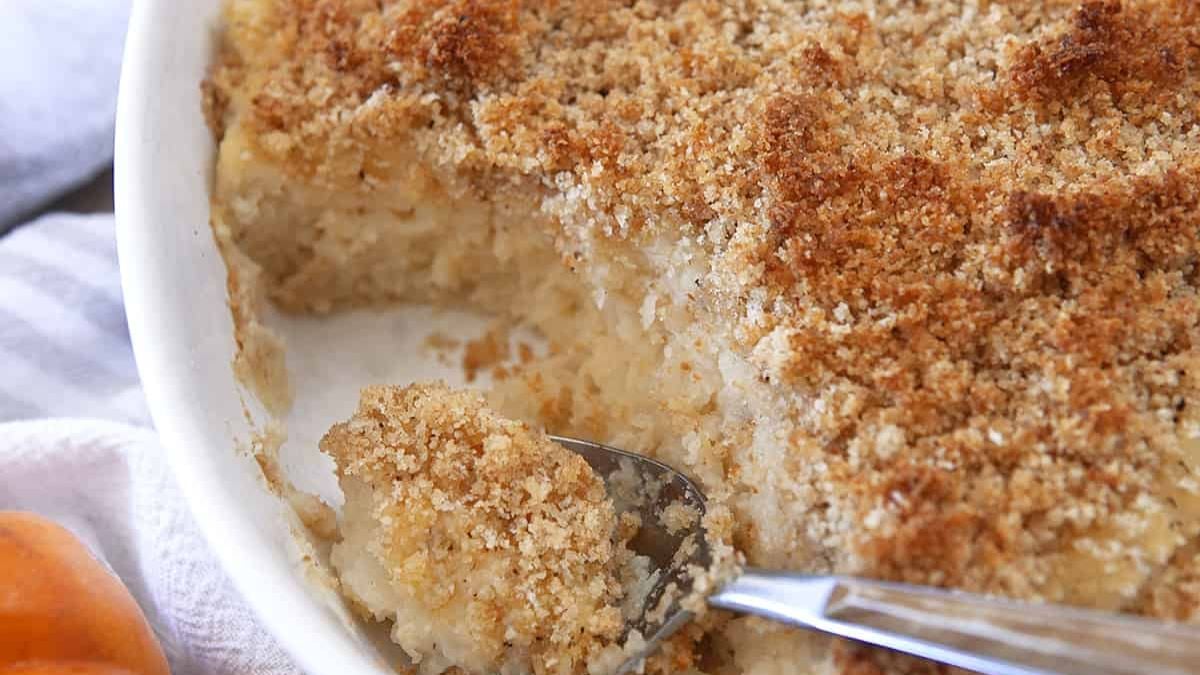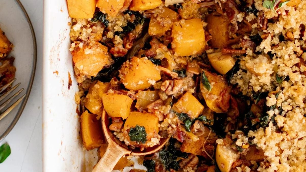 This savory Butternut Squash Casserole is filled with tender roasted butternut squash, thick-cut bacon, sweet apple, kale, and plenty of cheese. Topped with buttery panko breadcrumbs and baked until golden brown, this comforting casserole is rich, festive, and delicious – the perfect autumn side dish.