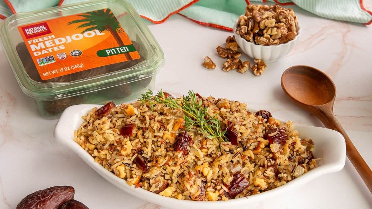 Wild Grain Casserole with Caramelized Onions, Dates, and Walnuts is a hearty side dish of wild rice varieties, studded with sweet, juicy Medjool dates and crunchy toasted walnuts.