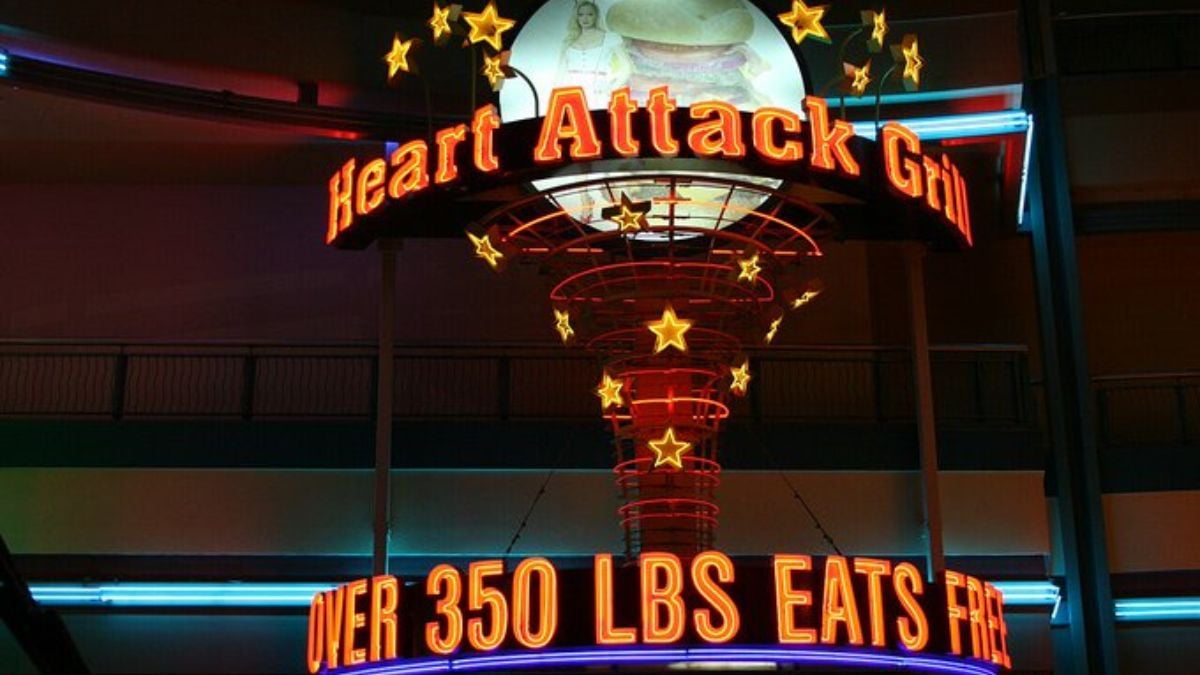 The Heart Attack Grill doesn’t tiptoe around its theme — it throws it straight at you the moment you walk in. Guests slip into hospital gowns, get weighed at the entrance, and are served by waitstaff dressed like nurses. The whole setup leans into the idea that this place is proudly unhealthy and wants you to know it. Even finishing an 8,000-calorie burger comes with a theatrical reward: getting rolled out in a mock wheelchair. It’s fast food as performance art, and the spectacle is half the experience.